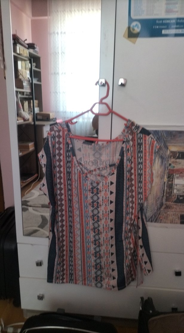 V yakalı, bağcıklı kollu, dökümlü ve bağlama desenli bohem tarzda, gri ve çok renkli midi uzunlukta bol kesim bluz. etiketi yok beden kısmını tam bilemiyorum ama m l bedene olacaktir