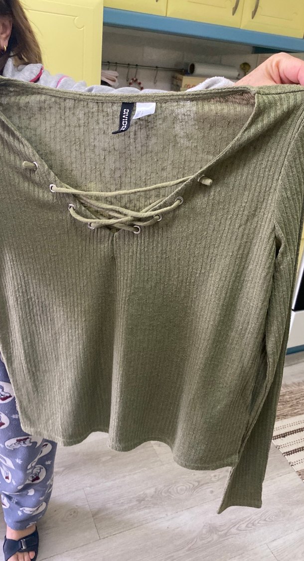 V yaka bağcıklı, uzun kollu, fitted kesim kadın triko kazak. Yumuşak triko kumaştan, günlük sokak stili için uygun, haki renkte.