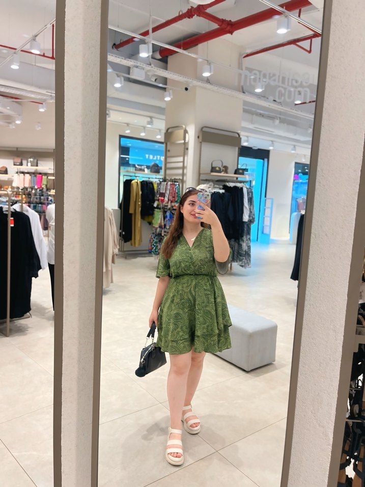 Bu açık haki midi elbise, V yaka ve askılı kollara sahip bol kesimlidir. Bağcıklı desen ve dantel detaylarıyla, yumuşak sentetik kumaştan üretilmiştir, günlük sokak stili için uygundur.