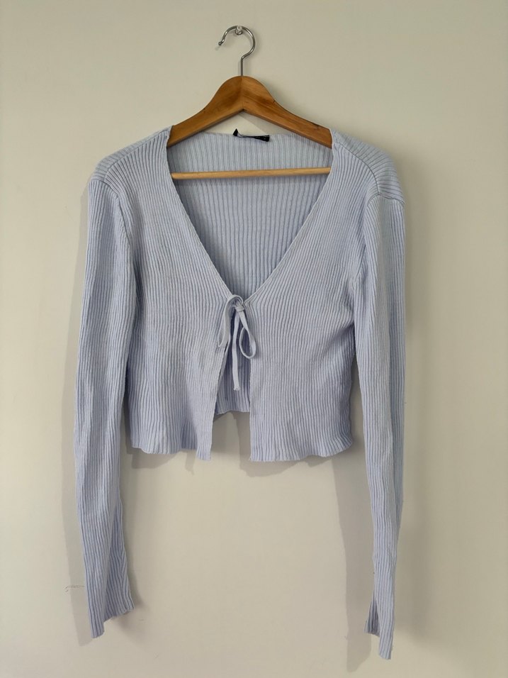 Yumuşak keten kumaştan, uzun kollu ve V yaka bağcıklı, triko dokulu, pastel tonlarda, normal uzunlukta ve fitted kesime sahip bir hırka.