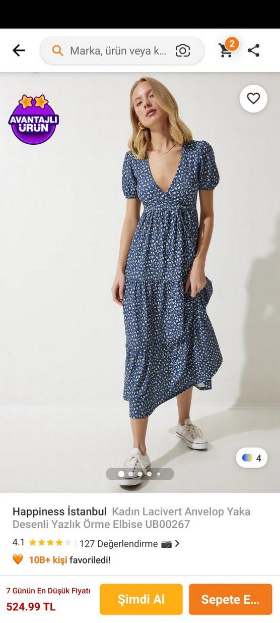 Navy renkli, bol kesim, V yakalı ve askılı kollu uzun elbise. Fırfır detaylı ve desenlidir. Güncel fiyatı da gözüküyor.
