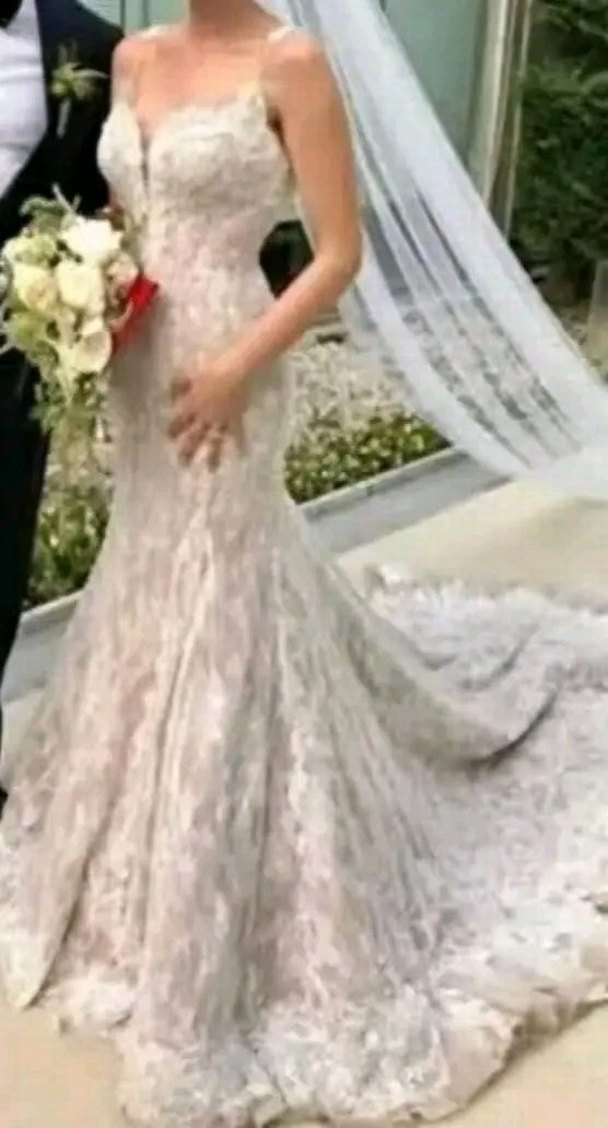 Kolsuz beyaz balık gelinlik, V yakalı, uzun kuyruklu, modern ve klasik zarafeti bir arada sunar. 36.38 beden