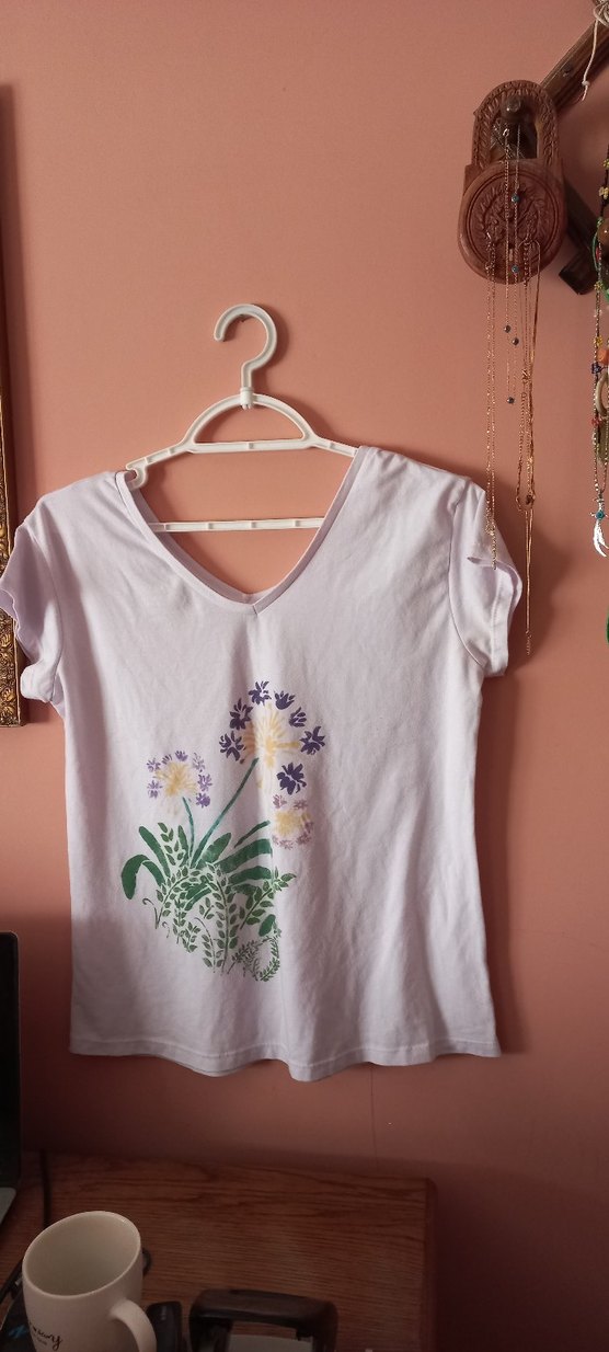 renkli, V yakalı ve kısa kollu tişörtü, bol kesimi ve pastel tonlarda çiçek baskısıyla günlük kullanım için uygundur.