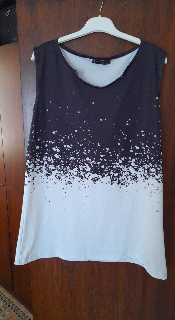 V yaka, batik desenli gri ve beyaz renklerde, kolsuz, midi boy ve bol kesim kadın bluz. Yumuşak sentetik kumaştan, günlük kullanıma uygun.