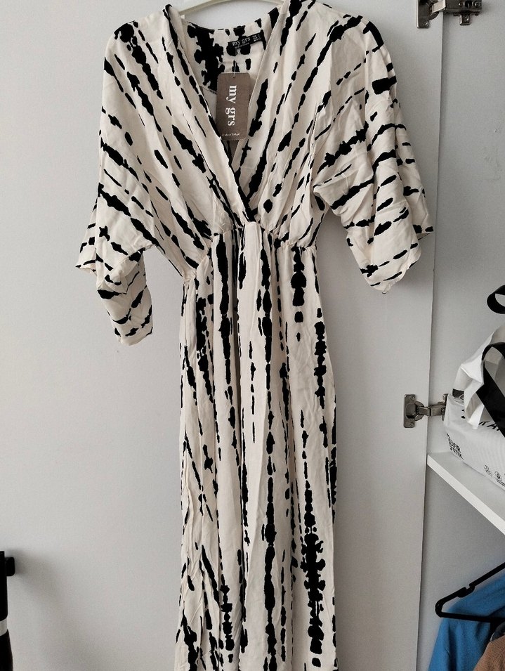 Beyaz ve gri batik desenli, V yakalı ve askılı kollu keten uzun elbise. Salaş kesimi ve drapeli stiliyle günlük kullanıma uygun bohem tarzda. hiç giyilmedi