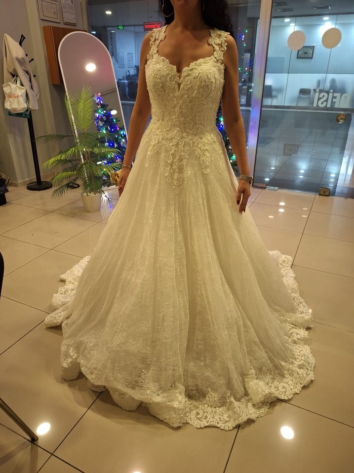 V yaka ve kolsuz tasarıma sahip bej A kesim gelinlik, dantel detaylarıyla klasik ve gösterişli bir görünüm sunar. Düzenli kesim ve uzun boydadır. Hiç giyilmedi, düğün iptal edildiği için satıştadır.