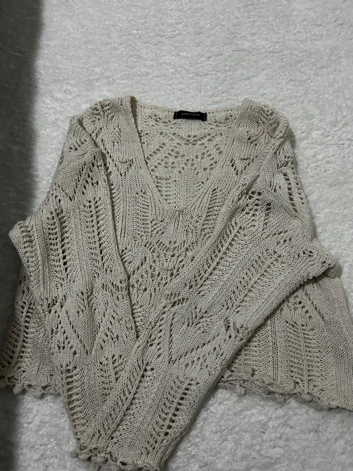 Bej renkli, V yakalı ve uzun kollu bohem tarzda örgü kadın kazak. Hiç giyilmedi tertemiz ❤️