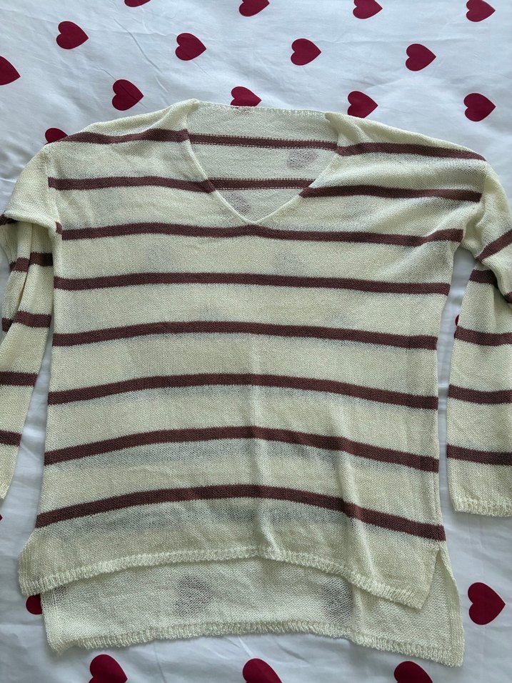 V yaka ve uzun kollu, gevşek kesim bej renkli çizgili örgü kadın kazak, normal uzunlukta ve rahat bohem tarzda.