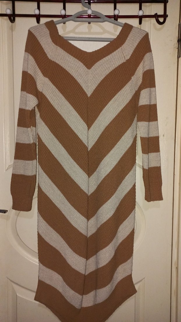 V yaka, uzun kollu, bol kesim uzub örme kazak, bej ve kahverengi çizgili, hic giyilmedi