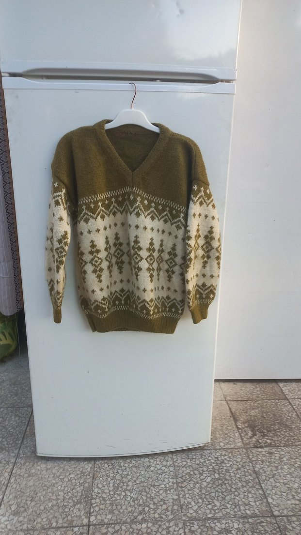V yaka ve uzun kollu, bol kesim kadın triko kazak. Bej zemin üzerine doğal tonlarda desenli, rahat ve günlük kullanıma uygun. #unixeskazak #vintagekazak #kazak standart beden