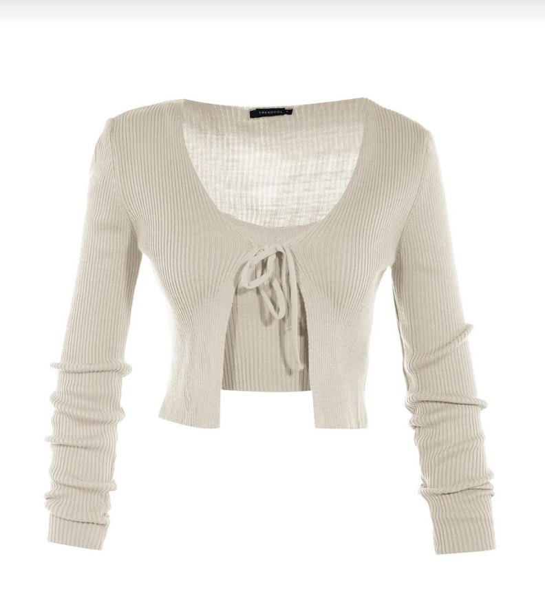V yaka, uzun kollu, bej renk ince triko kazak. Önde bağlama detayı ve midi boy, sade desensiz tasarım, günlük kullanım için uygundur.