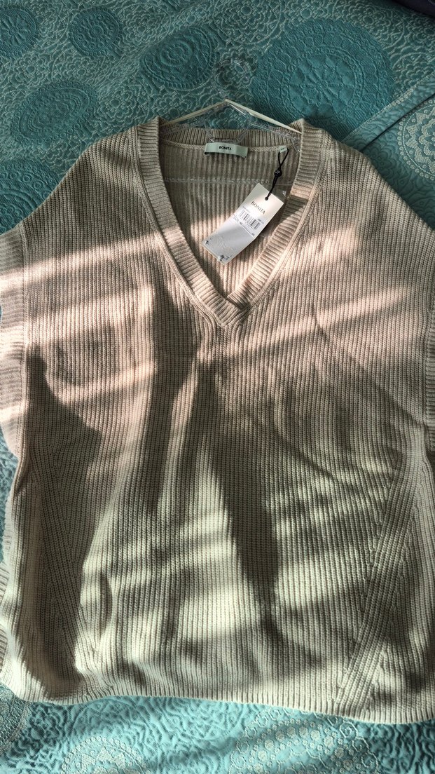 V yaka, bej renkli, örme kumaştan yapılmış, salaş kesim ve kolsuz kadın süveter. Günlük kullanıma uygun, rahat ve trend bir normcore tarz sunar. Yandan düğmeli. Beden M (esnek olduğundan L beden giyenlere de olur) Ürün hiç giyilmedi ve defosu yoktur. Yurt dışından alındı. Orjinal fiyatı 60 Euro Marka: BONITA (Germany)