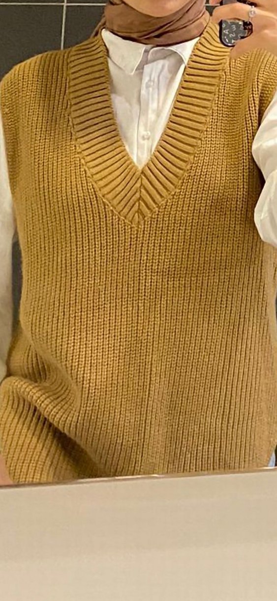 Bej renkli, V yakalı, triko dokuma kadın süveterdir. Normal uzunlukta, kolsuz ve rahat kesimlidir. Günlük kullanıma uygundur. ✨ S/M/L uyumlu