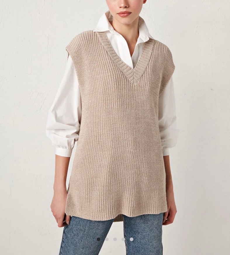 Bej renkli, V yakalı, triko örme kadın süveter. Normal boyda, salaş kesim ve kolsuz tasarımıyla günlük kullanıma uygundur.