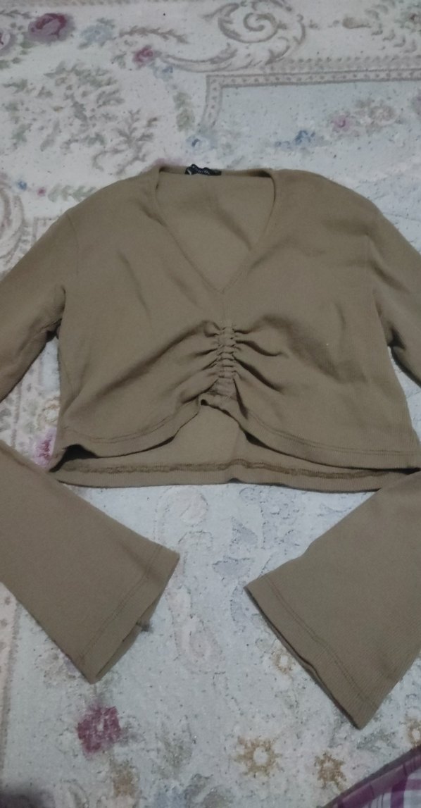 V Yaka Bej Mini Keten Kadın Bluz