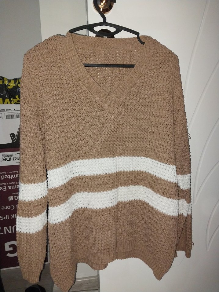 V yaka, uzun kollu bej örgü kadın kazak. Rahat kesim ve normal boyda, önünde iki beyaz yatay çizgi bulunur. Günlük rahat kullanıma uygundur.