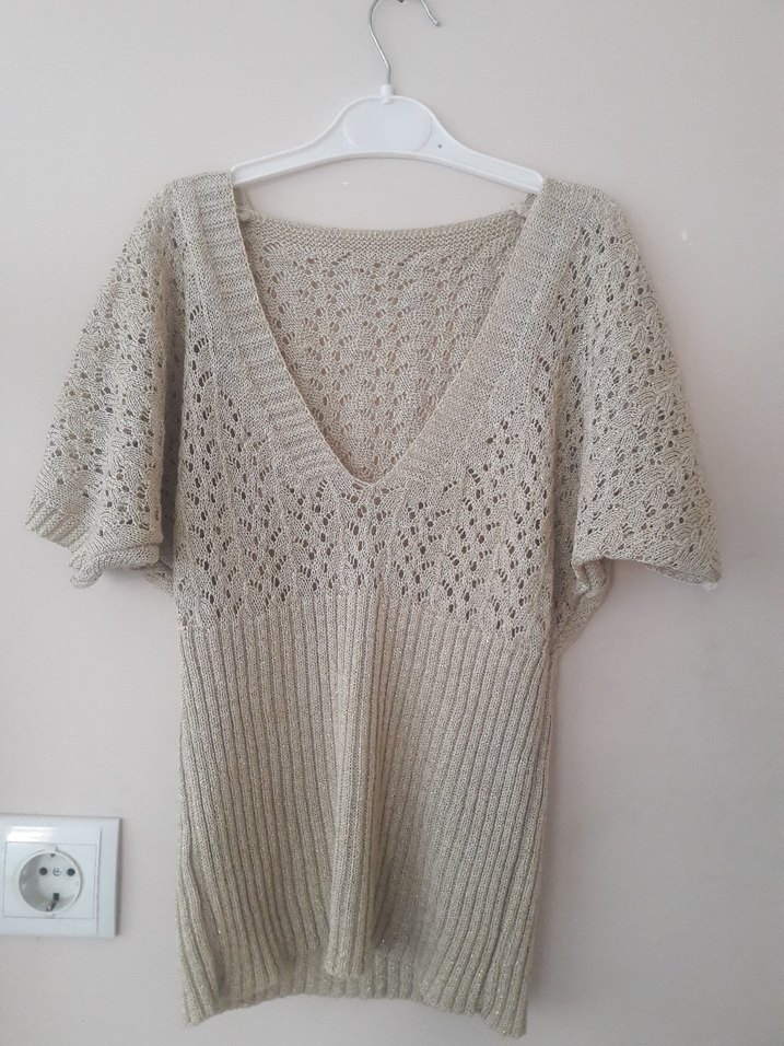 Bej renk, V yakalı, kısa kollu, örgü kadın kazak. Bol kesim ve rahat, bohem tarzıyla günlük kullanıma uygundur.