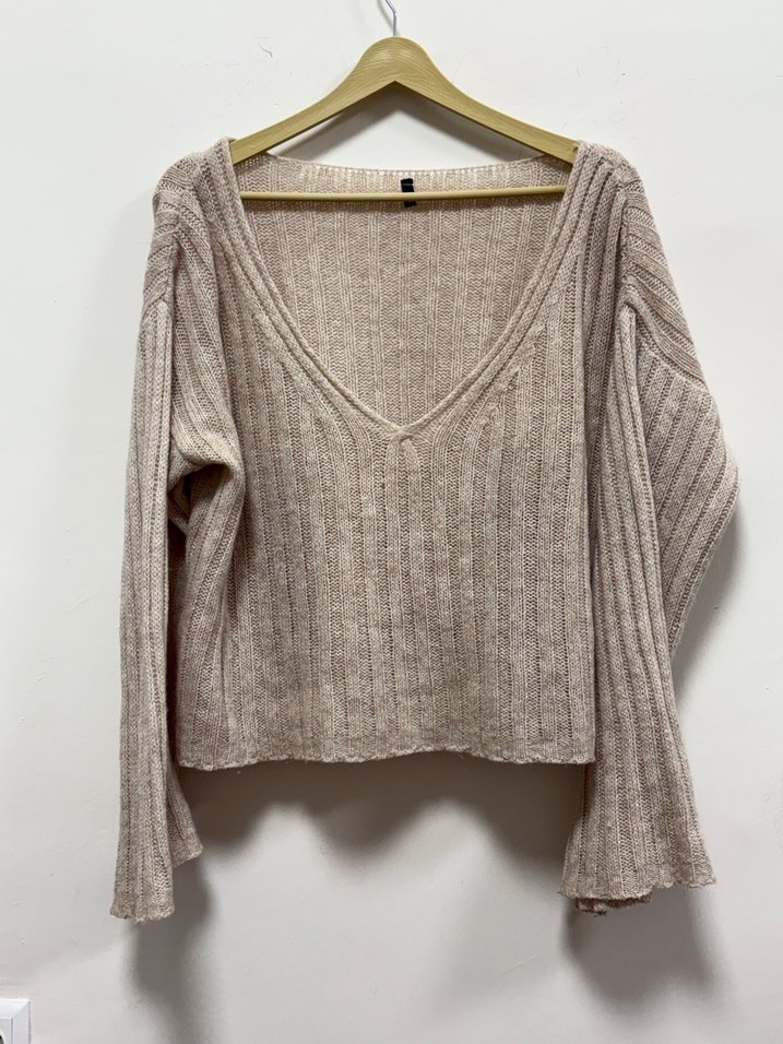 V yaka, uzun kollu, bol kesim bej örgü kadın kazak. Rahat ve bohem tarzıyla günlük kullanıma uygundur.