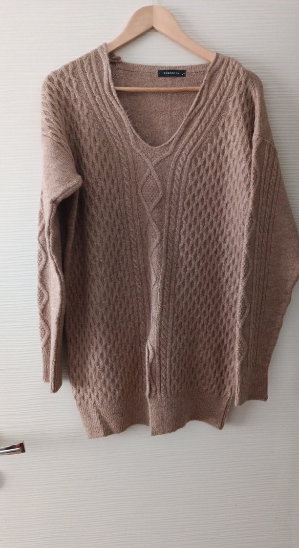 Bej renkli, V yakalı ve uzun kollu örgü kadın kazak. Rahat ve bol kesimiyle günlük kullanıma uygun, sade ve şık bir parça.