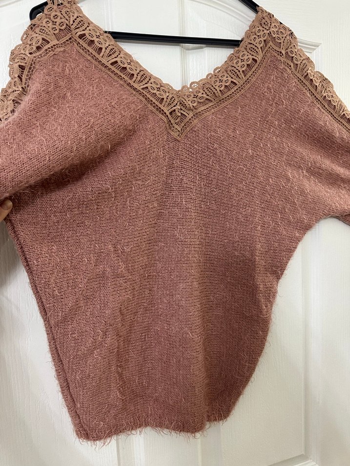 Bej renkli örgü kazak, V yaka ve ince örgü dantel detaylara sahiptir. Uzun kollu, bol kesim ve midi boyda, rahat ve bohem tarzda günlük kullanım için uygundur. Kırçıllı kumaştan yumuşak dokuludur