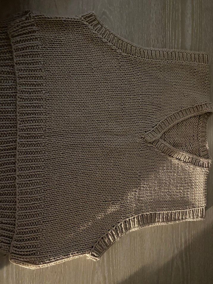 Bej renkli, V yakalı, örme kadın süveter. Kolsuz ve vücuda oturan kesimiyle sade, bohem tarzda, günlük kullanıma uygun.