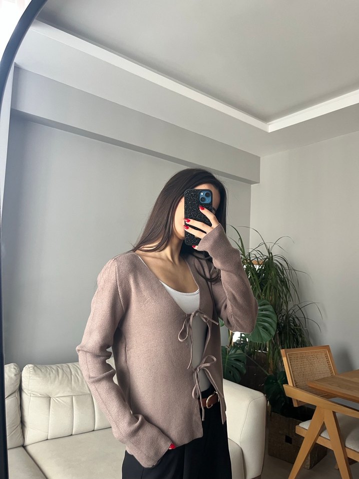 Bej renkli örme kumaştan, V yakalı ve uzun kollu salaş kesim kazak. Midi boyu ve desensiz tasarımıyla günlük sokak stiline kolay şıklık katıyor.