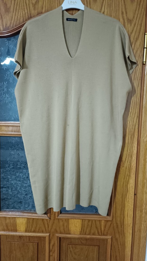 V yakalı, kısa kollu, dökümlü ve bol kesim kadın triko elbisesi. Yumuşak sentetik kumaştan yapılmış, bej rengindedir ve günlük kullanıma uygundur.