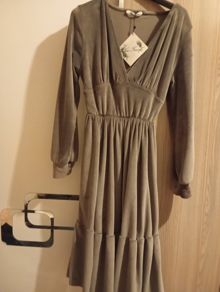 Bej süet kumaştan, V yakalı, bol kesim ve drapeli uzun elbise. Uzun kollu, bohem tarzda, günlük kullanıma uygun. hiç giyilmedi. likralı.