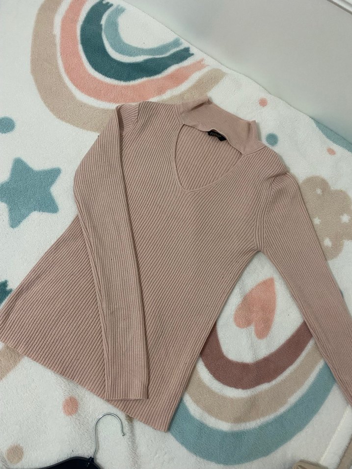 V yakalı, uzun kollu, bej renkli, triko dokuma, normal boyda kadın kazak.