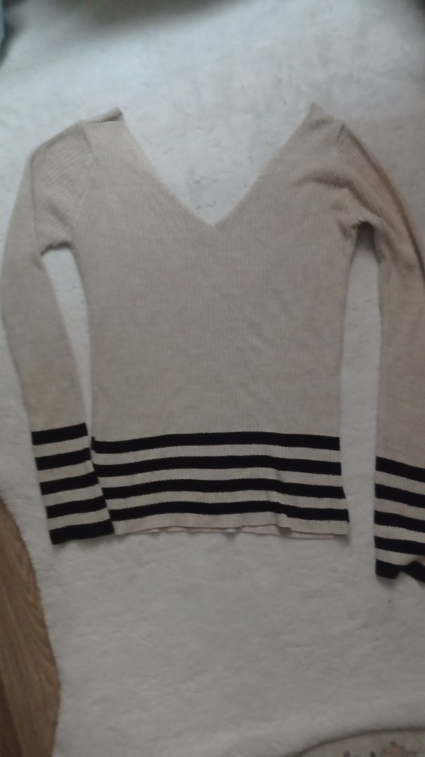 Uzun kollu, V yakalı, bej renkli triko kadın kazak. Manşet ve etek kısmında siyah çizgiler bulunur, dar kesimdir.