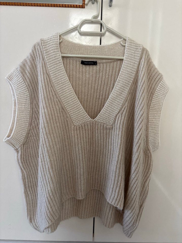 Bej renkli, V yakalı, örme kumaştan yapılmış, kolsuz ve bol kesimli rahat bir kadın süveteridir. 1-2 kez anca giymişimdir.