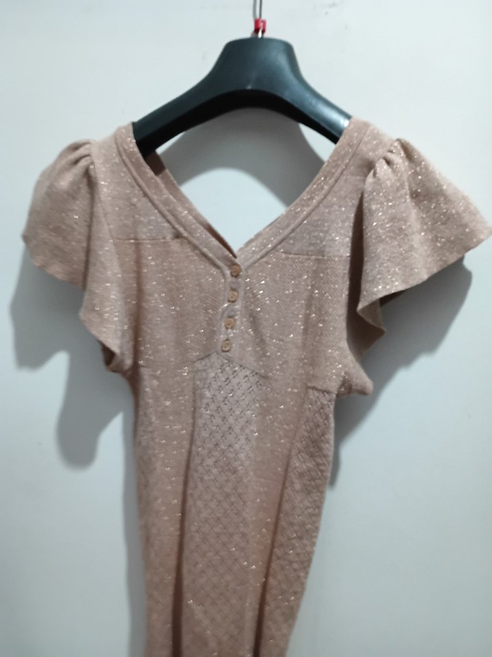 Bej renkte, V yakalı ve kısa kolları uçuşan triko üst, parlak dokusu ve bol kesimiyle rahat ve bohem bir tarz sunar.