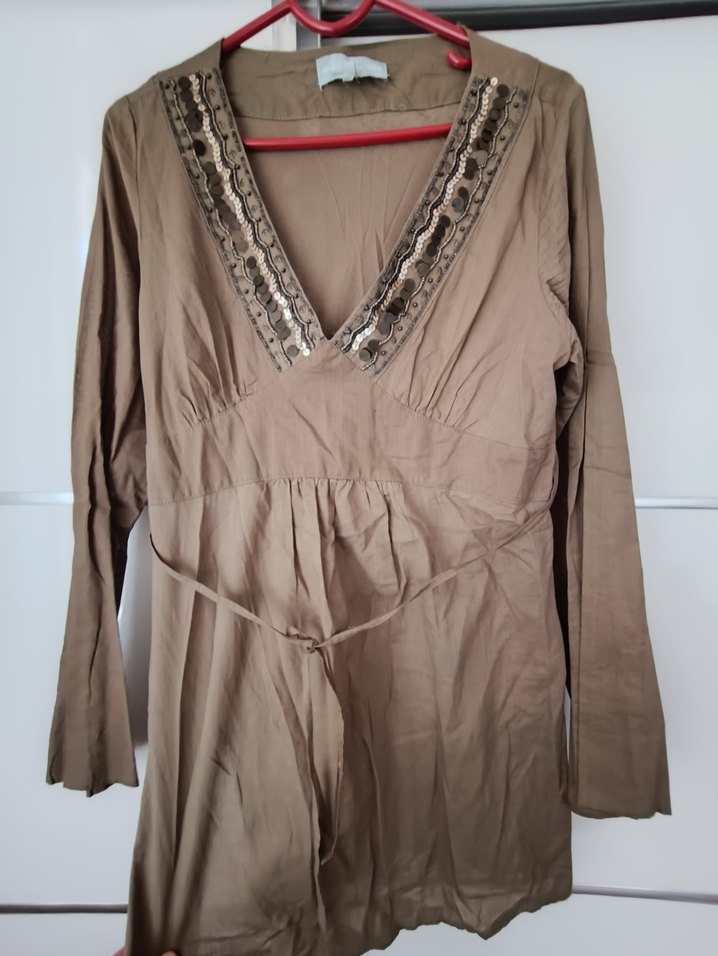 V yaka, uzun kollu, belden bağlamalı bej hamile tuniği. Yumuşak keten kumaştan, payet detaylı ve bol kesimdir. Günlük kullanım için uygundur.