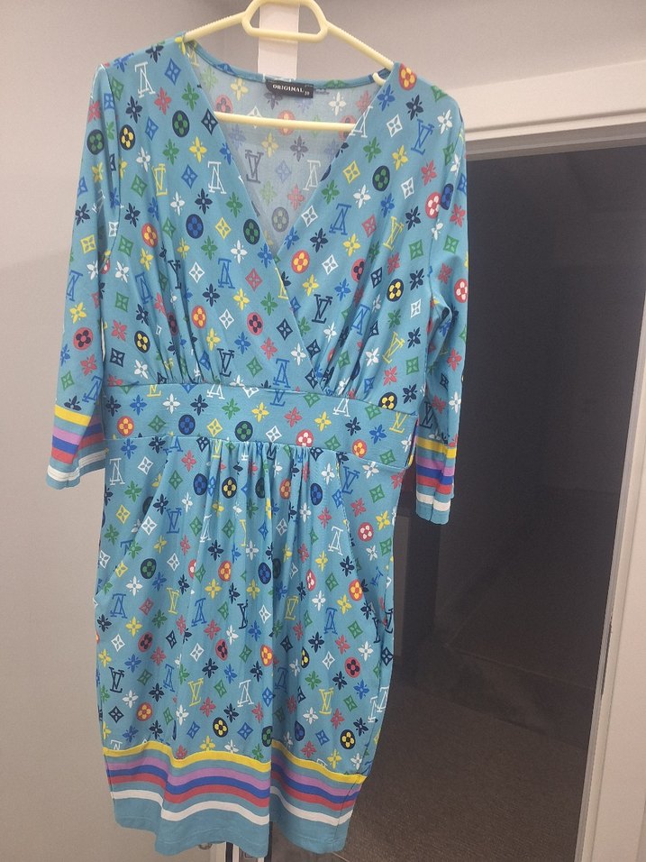 V yaka ve beli kuşaklı, sentetik kumaştan yapılmış, pastel çok renkli batik desenli, dar kesim midi elbise. Rahat sokak stili için uygundur.