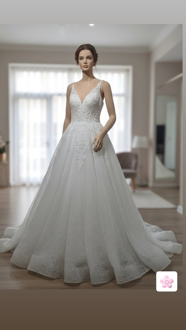 V yakalı, askılı beyaz A kesim uzun gelinlik. 36 beden 50 kiloyla giyildi yoğun ışıltılı simlli tül inci detaylar özerinde dantel işlemeler kişiye özel dikildi sadece 1 kez giyildi kuru temizleme yapılmadı uygun fiyata veriyorum
