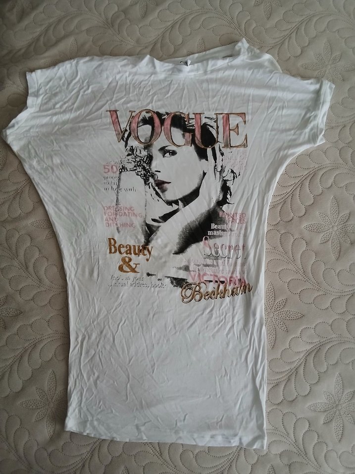 Pamuklu, beyaz kısa kollu, V yaka, baskılı vintage Vogue desenli, bol kesim kadın tişörtü. Normal midi boyda, sokak modasına uygun. ✨