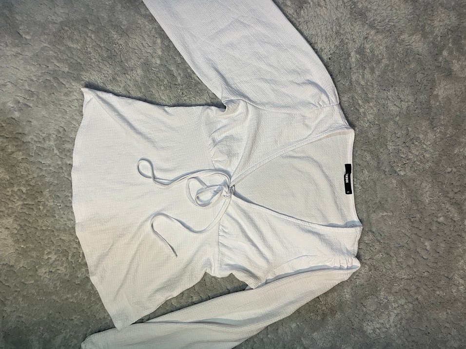 Uzun kollu, V yakalı, beyaz keten bluz. Normal midi boyda, rahat ve şık, günlük dış mekan kullanımı için uygun.