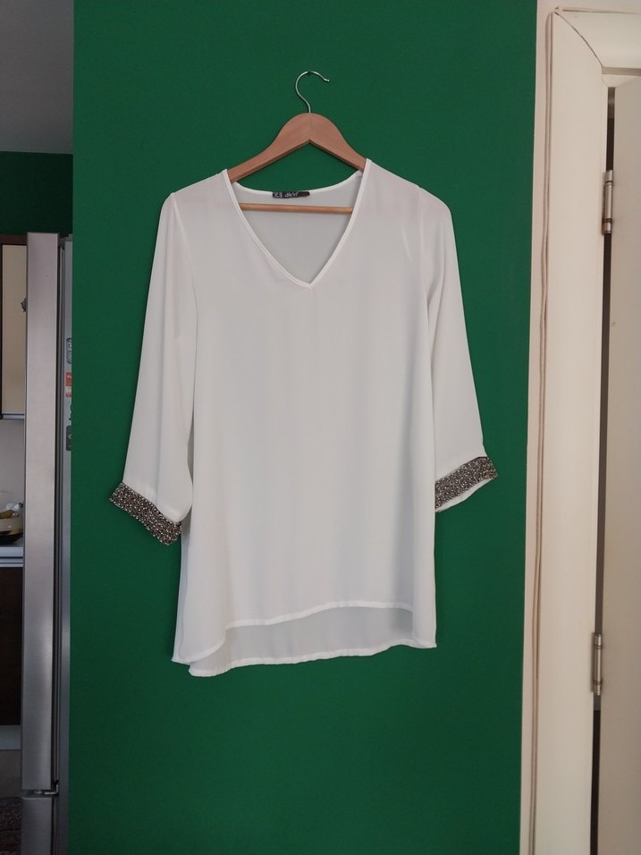 V yaka ve işlemeli manşetlere sahip uzun kollu beyaz bluz. Rahat kesim ve midi boy, yumuşak sentetik kumaştan üretilmiştir, günlük kullanıma uygundur. ✨