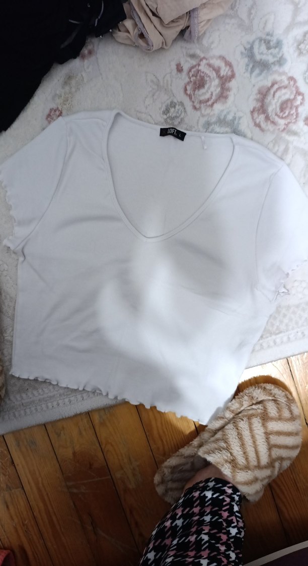 V Yaka Beyaz Crop Top, Kısa Kollu, Bol Kesim