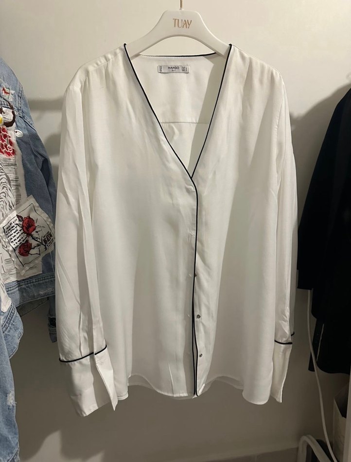 Beyaz, V yakalı, uzun kollu, düğmeli, bol kesim kadın gömleği. İpeksi kumaştan, rahat ve şık günlük kullanıma uygun. ✨