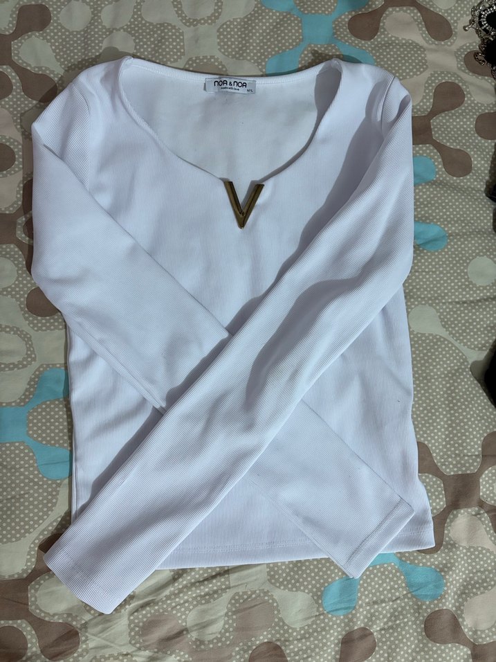 Pamuk kumaştan, V yaka ve uzun kollu beyaz hamile tişörtü. Günlük kullanıma uygun, normal boyda, vücuda oturan kesim. Minimalist ve şık görünümlü.