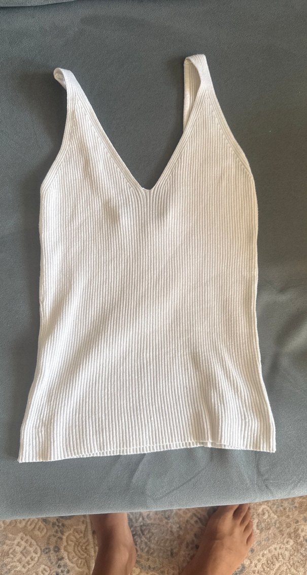 Pamuklu, ince örgü beyaz atlet, V yaka ve kolsuz tasarıma sahip. Normal midi uzunluğunda, minimalist ve günlük sokak stiline uygun.