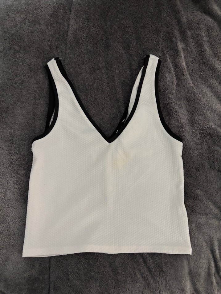 V yaka ve kolsuz, beyaz renkli kadın atlet. Yumuşak sentetik kumaştan, günlük kullanıma uygun sade ve şık tasarım.