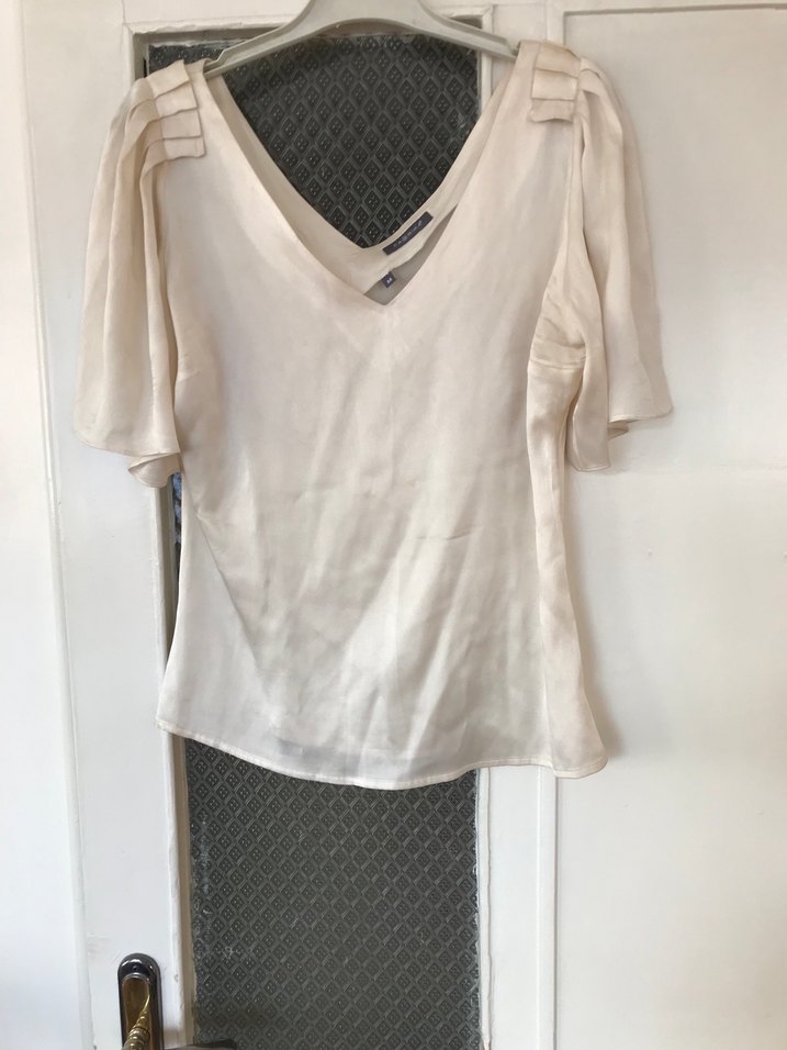 Beyaz V yakalı, kısa kollu ve bol kesimli kadın bluz. İpeksi kumaştan üretilmiş, ofis için çağdaş ve zahmetsiz şıklık sunar. Desensiz ve midi boydadır. İpek bluzdur.