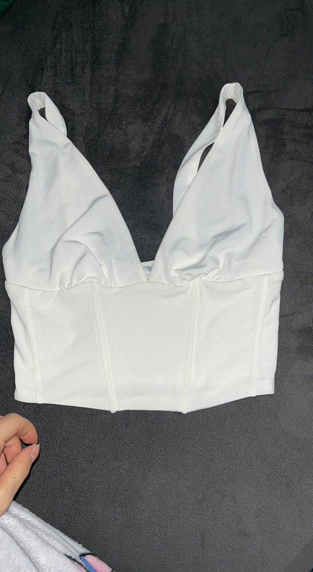 V yaka ve kolsuz tasarıma sahip, beyaz sentetik kumaştan yapılmış, dış mekanlarda rahat kullanılabilen şık ve dikkat çekici büstiyer.