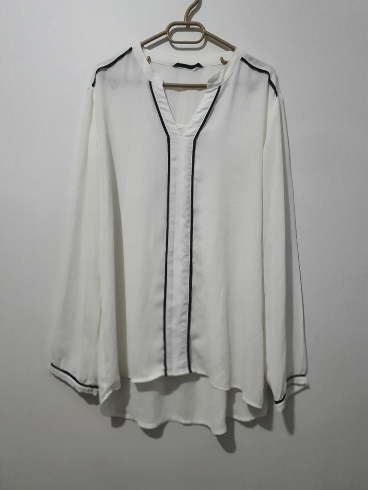 V yaka, uzun kollu beyaz pamuk gömlek, siyah şerit detaylarla minimal ve rahat kesim. Ofis için uygun, şık ve sade görünümlü.
