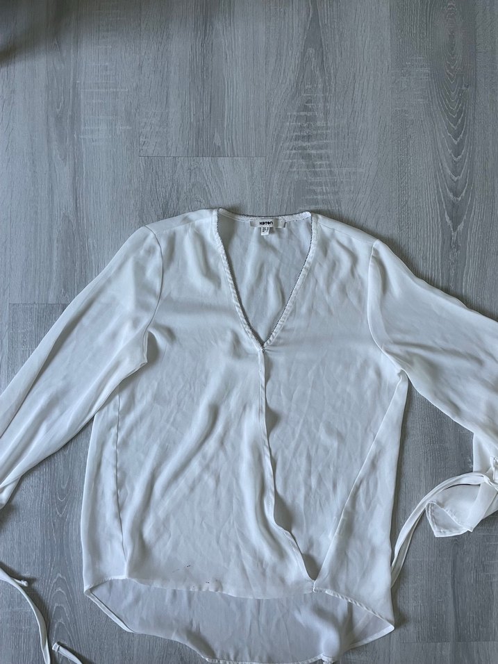 V yaka, uzun kollu beyaz kadın keten gömlek. Rahat kesimli, normal midi boyunda, desen içermeyen minimalist günlük tarzda. fotoğrafta belirtildiği gibi defosu mevcuttur ama belli olmuyor