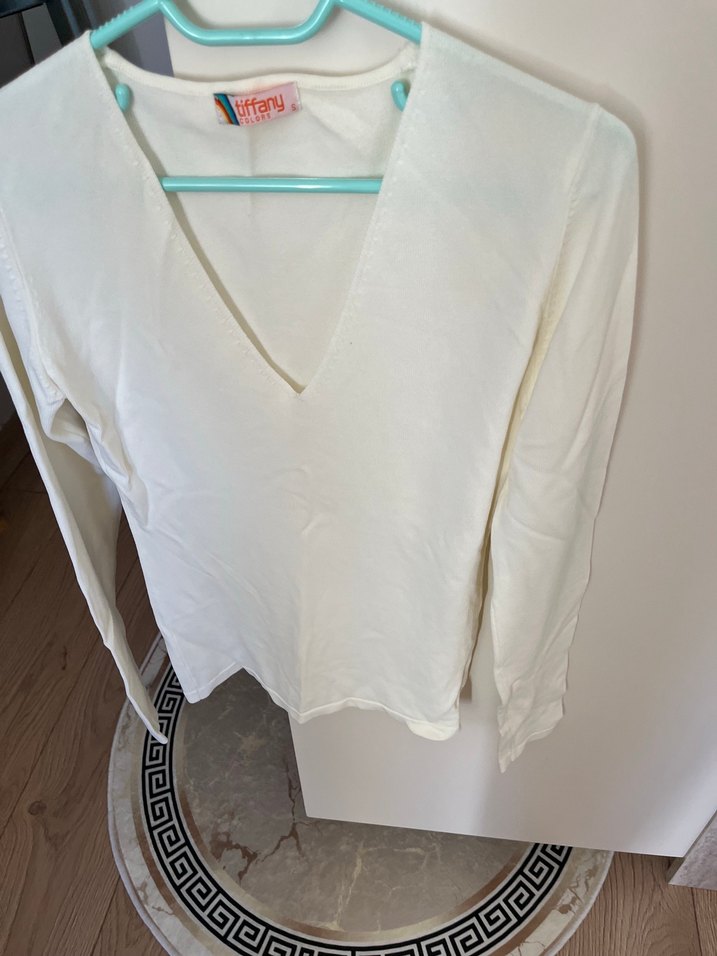 V yaka ve uzun kollu, pamuklu beyaz kadın kazak