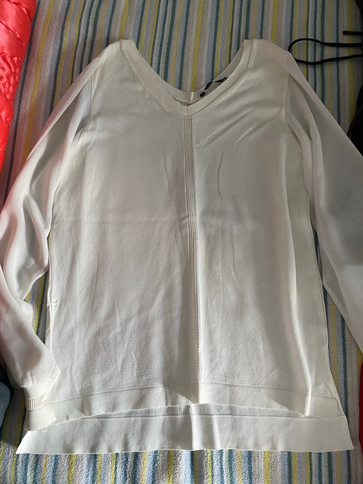 Beyaz pamuklu triko, uzun kollu ve V yakalıdır. Rahat ve salaş kesimiyle günlük şıklık sunar. Trendy casual stil için uygundur.