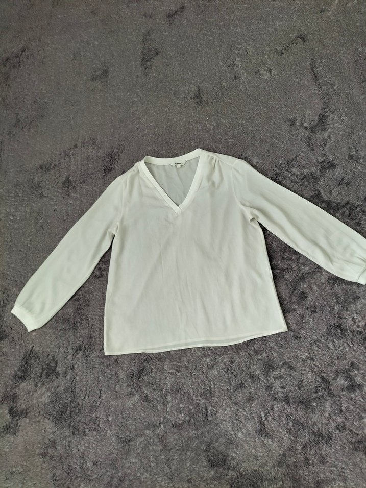 Beyaz, uzun kollu ve V yakalı kadın bluzu, normal boyda ve salaş kesimlidir. Minimalist tarzda, günlük kullanıma uygundur. ✨